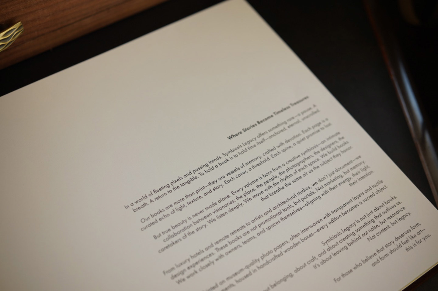 Symbiosis Legacy books become part of your ambiance, your visual identity, and your guest journey. They are conversation pieces, marketing assets, and emotional anchors — blending art direction, editorial beauty, and brand storytelling into a timeless object.